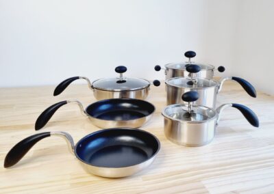 - Saucepans with pouring lips and dual drainage holes for safer, easier draining