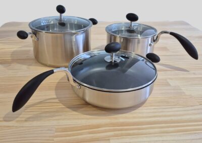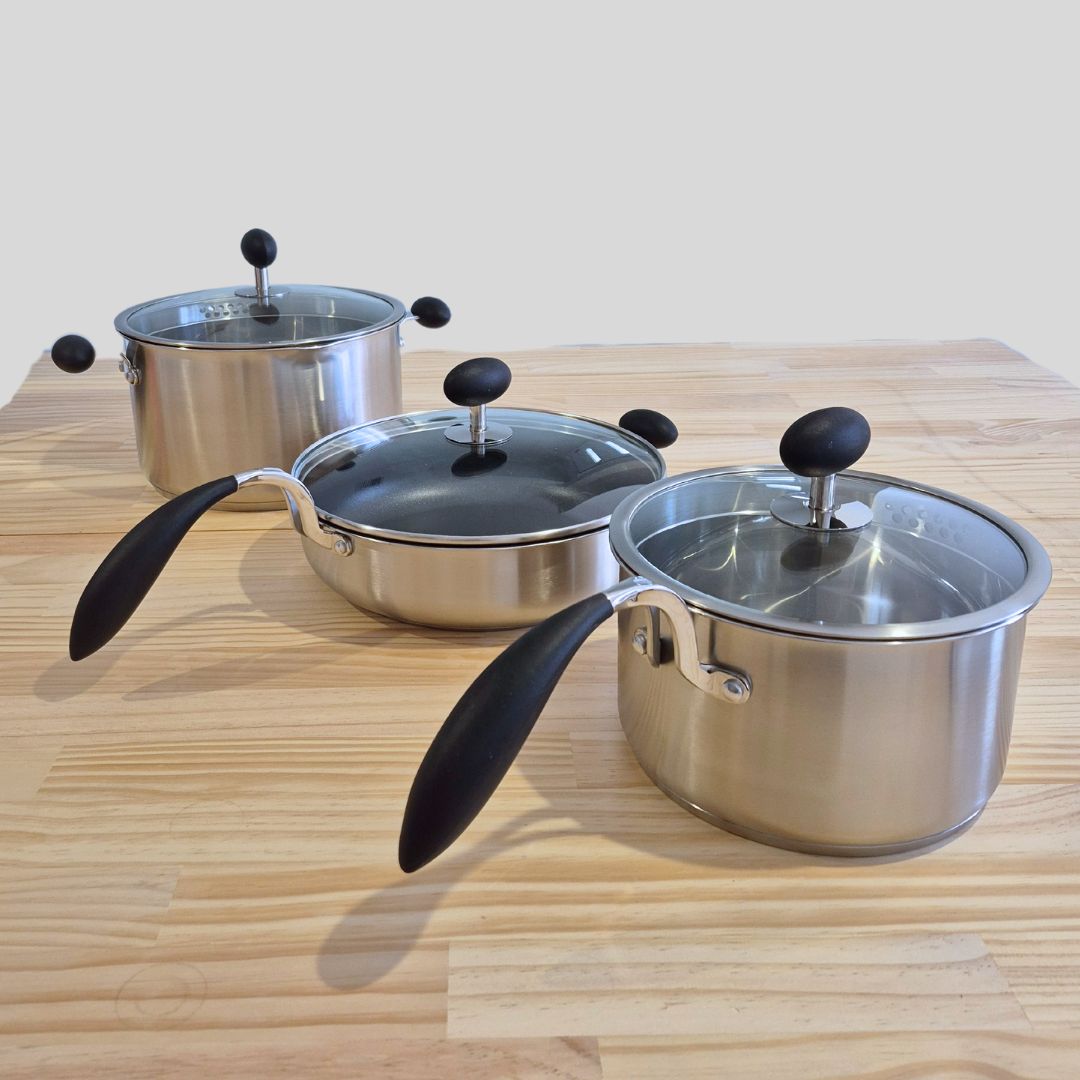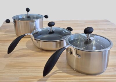 - Saucepans feature pouring lips and dual-size drainage holes for safe, easy draining