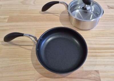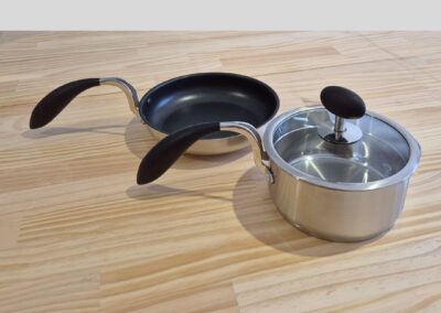 - Saucepans with pouring lips and dual drainage holes for safe, easy draining