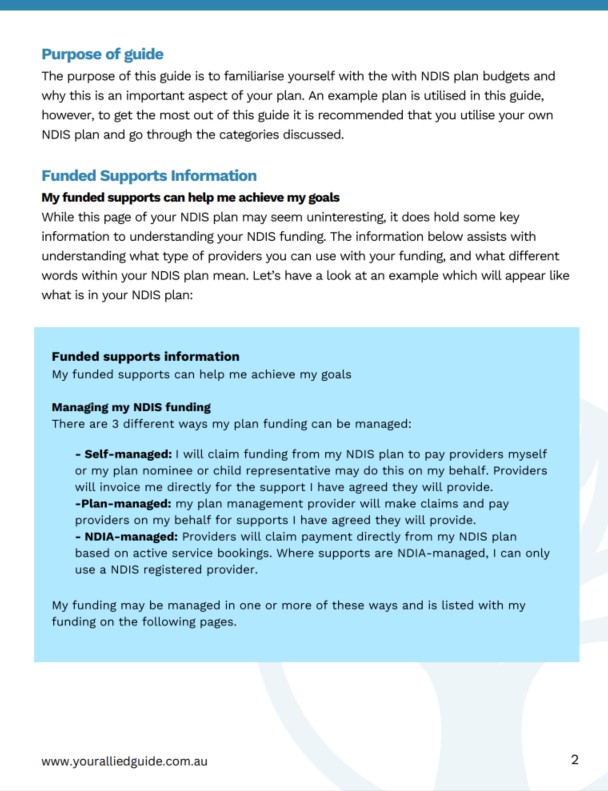 What are the different NDIS funding categories? How do I interoperate my plan budget? The team at Your Allied Guide are here to help get you ready for your journey now that you have an approved NDIS Plan. This 21 page guide will help interpret the budgets and funding types within your plan so you are better placed to get the most out of your approved plan.
