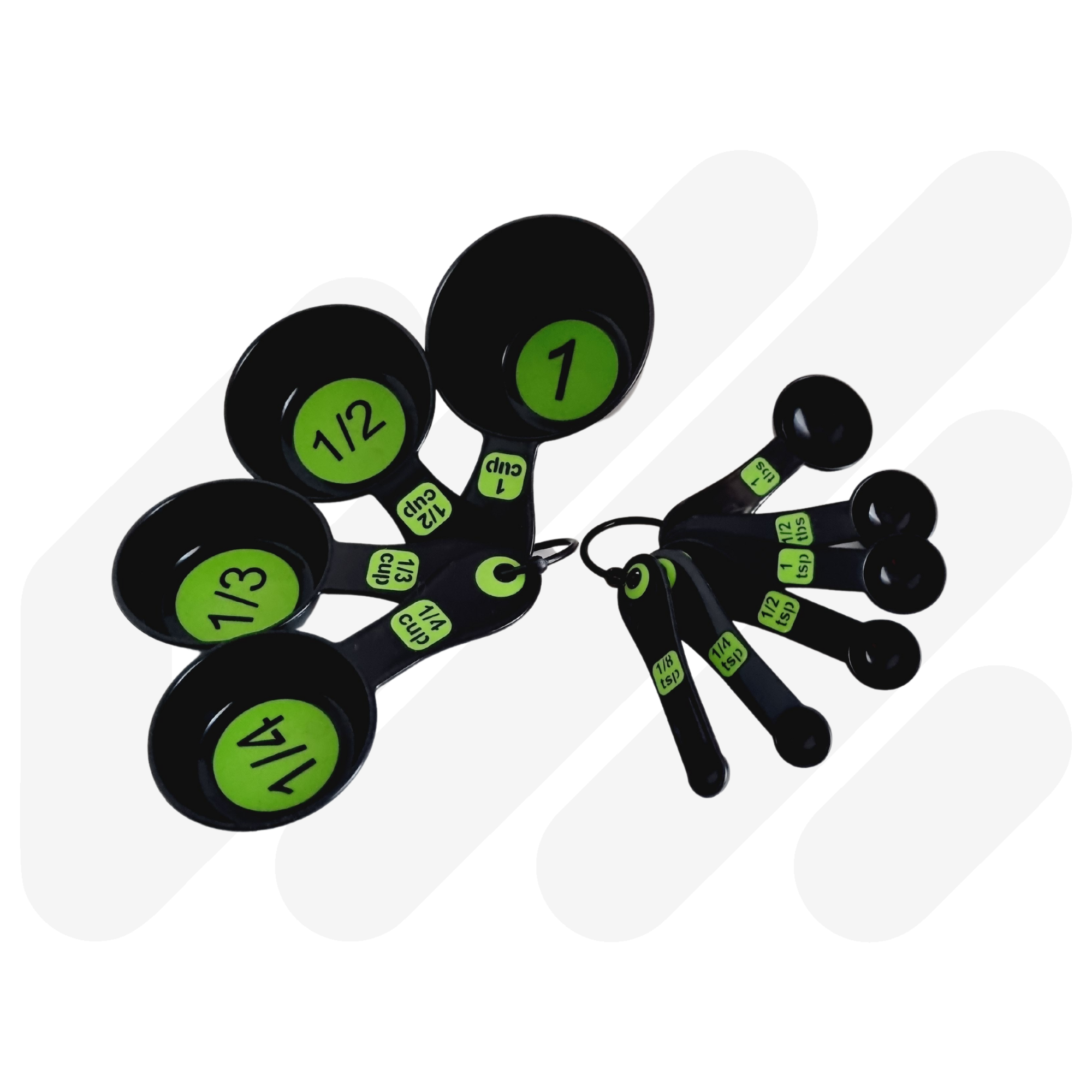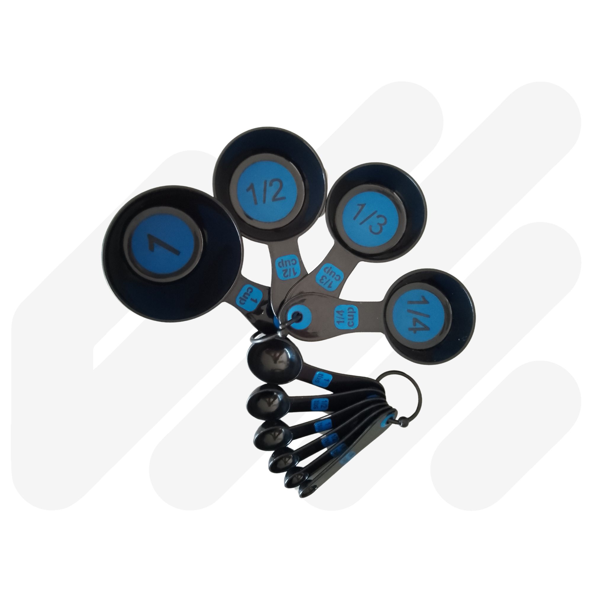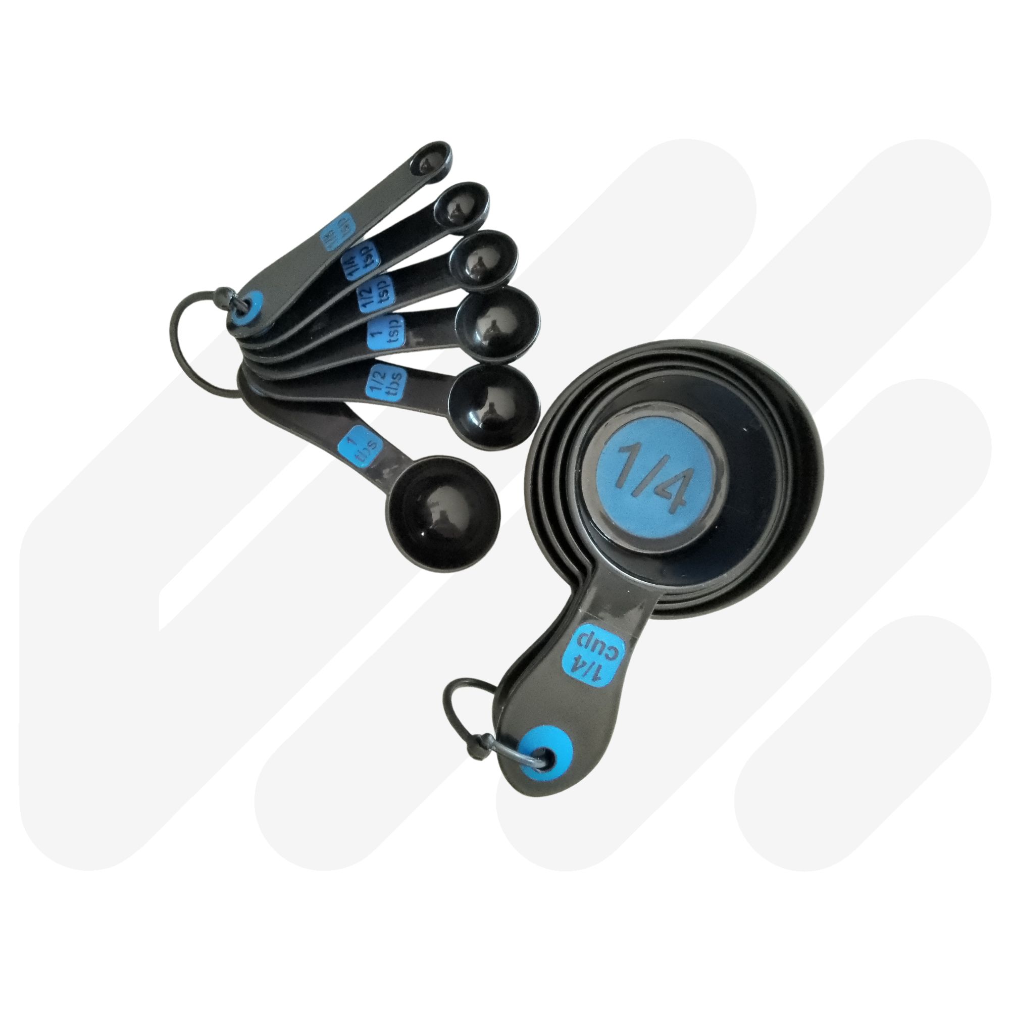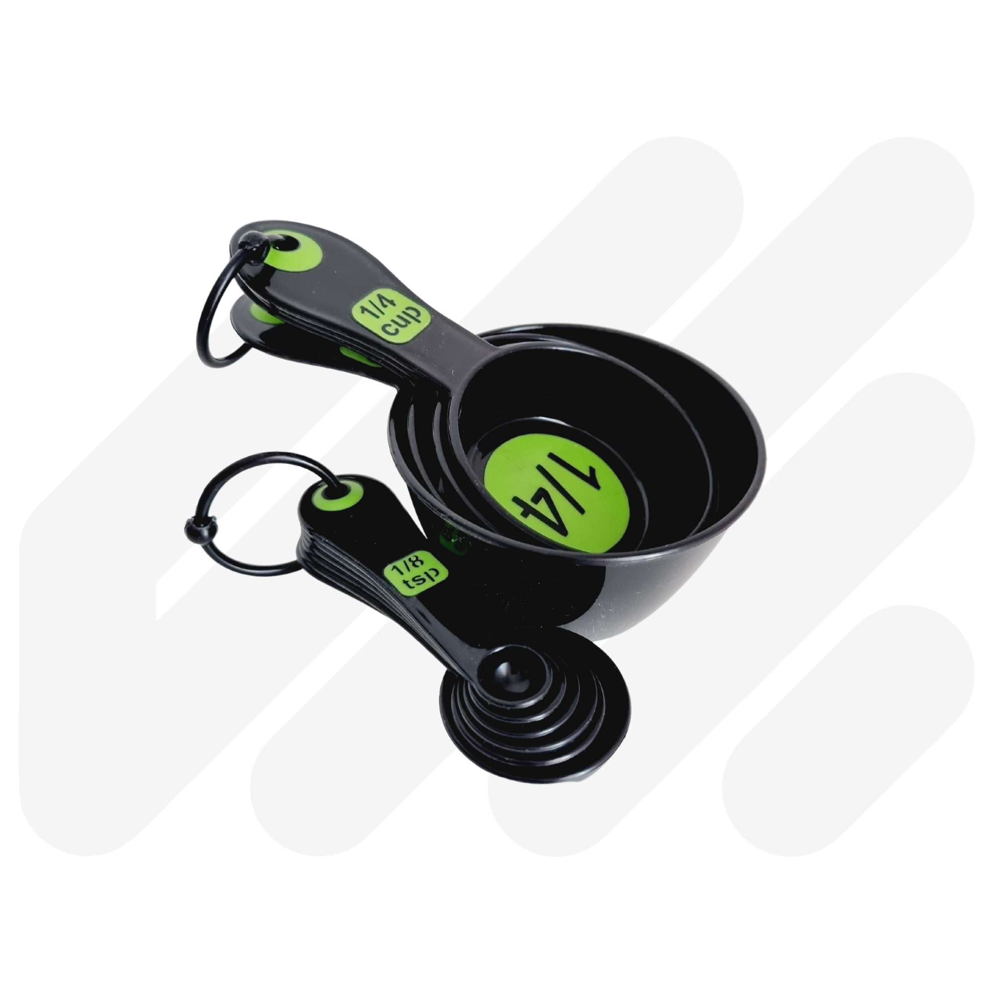 High contrast coloured with clear measurements for easy identification. This set combines a 4pc measuring spoon set and 6pc measuring cup set which are held together by a removable clip. Available in Black/Green, White/Blue and Black/Blue.