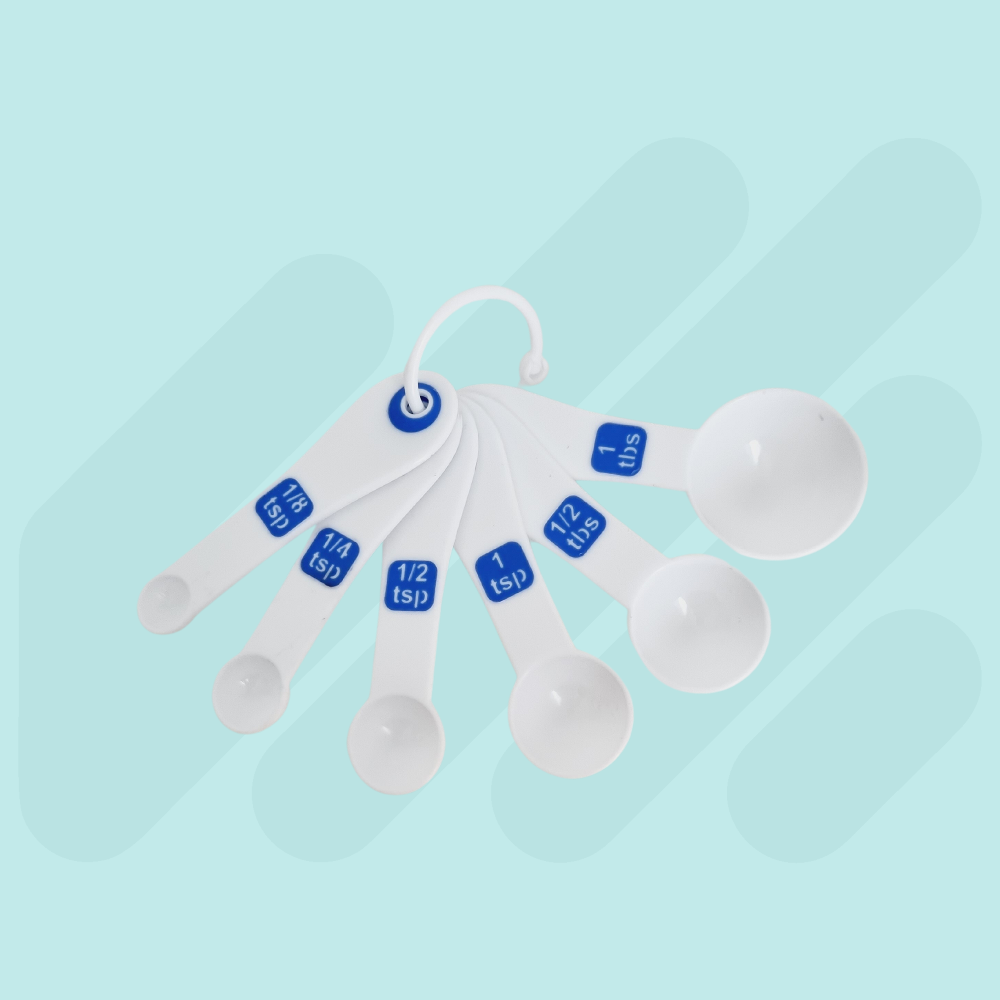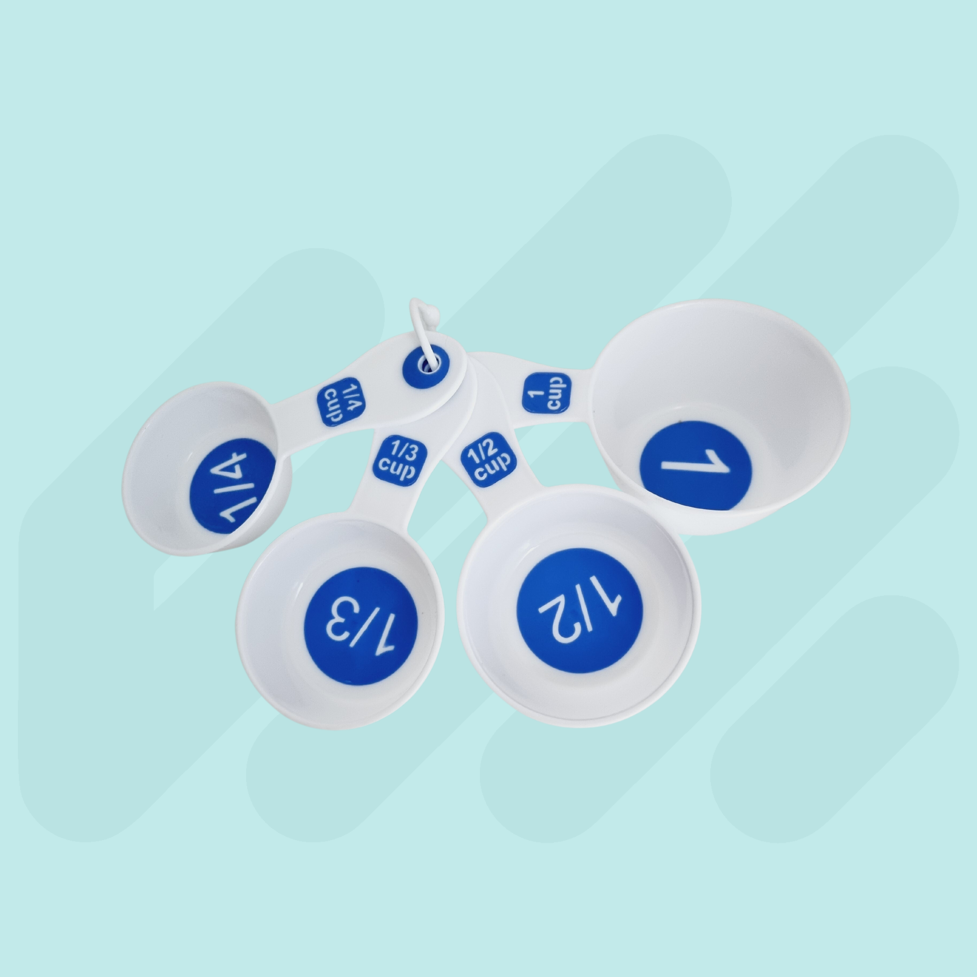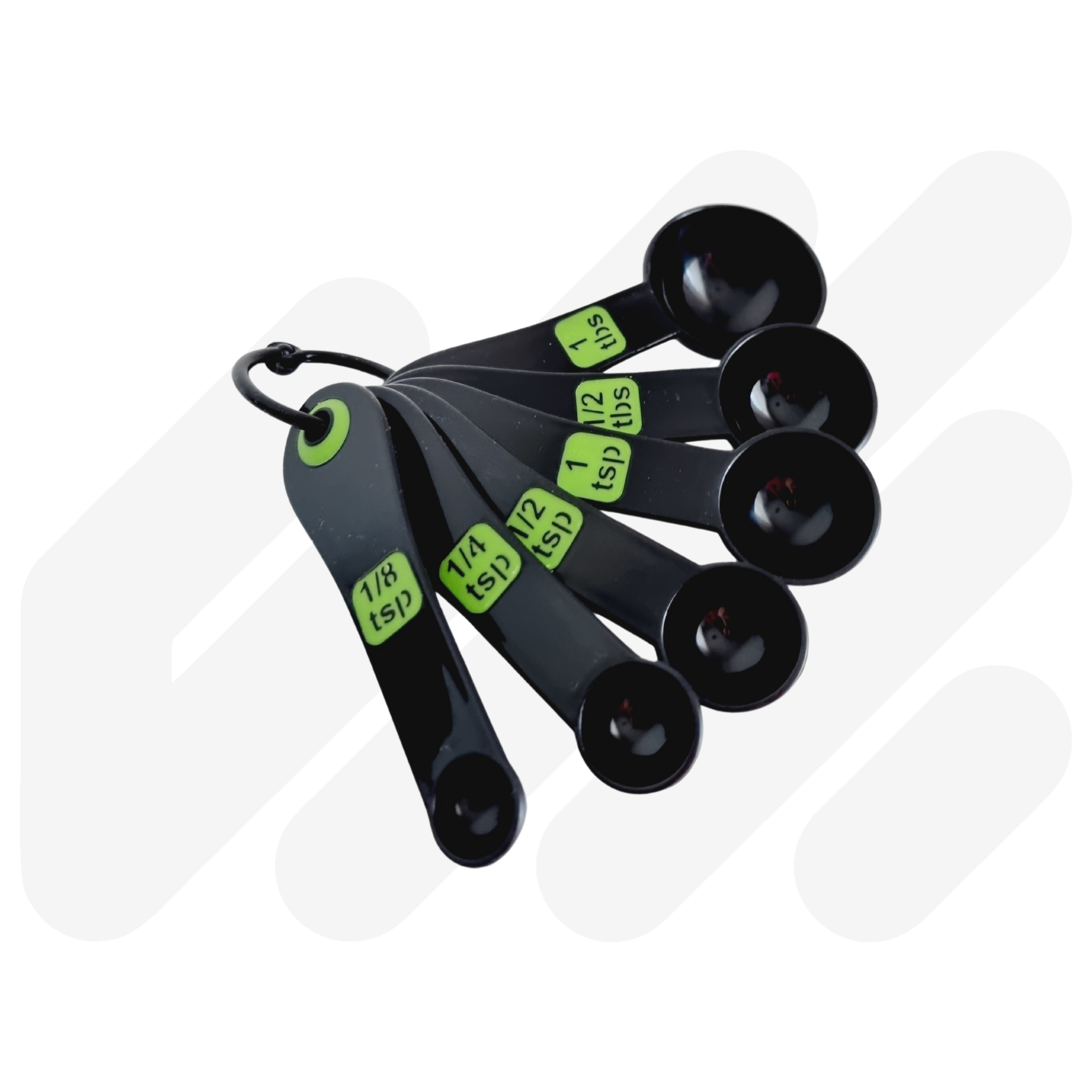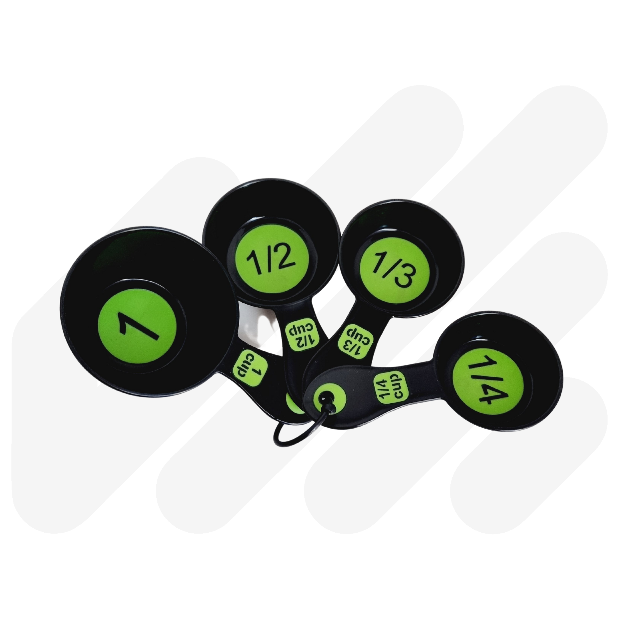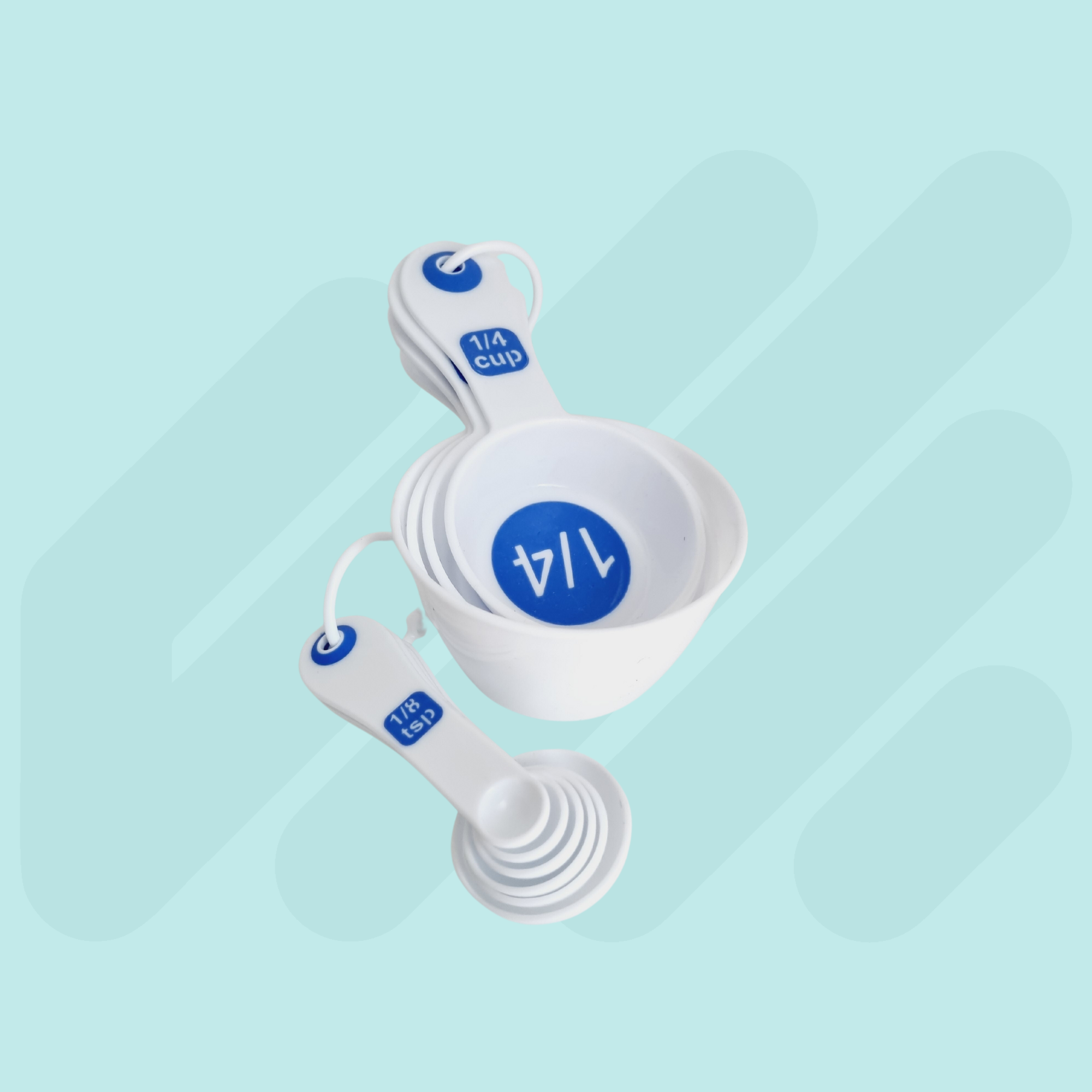 High contrast coloured with clear measurements for easy identification. This set combines a 4pc measuring spoon set and 6pc measuring cup set which are held together by a removable clip. Available in Black/Green, White/Blue and Black/Blue.