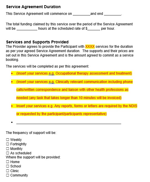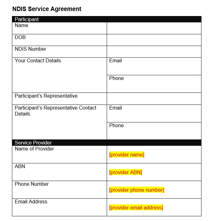 The NDIS Service Agreement Word Template from Your Allied Guide contains the relevant sections needed for your service agreement to conform to the requirements outlined by the NDIA.