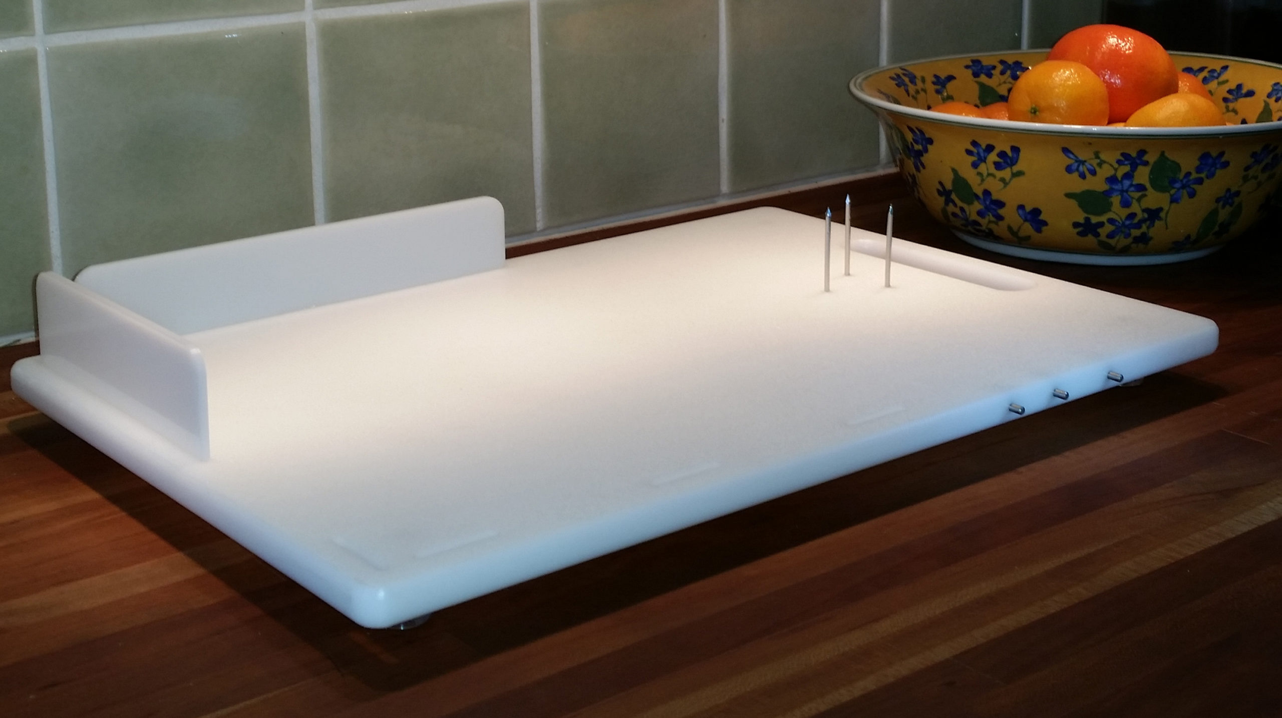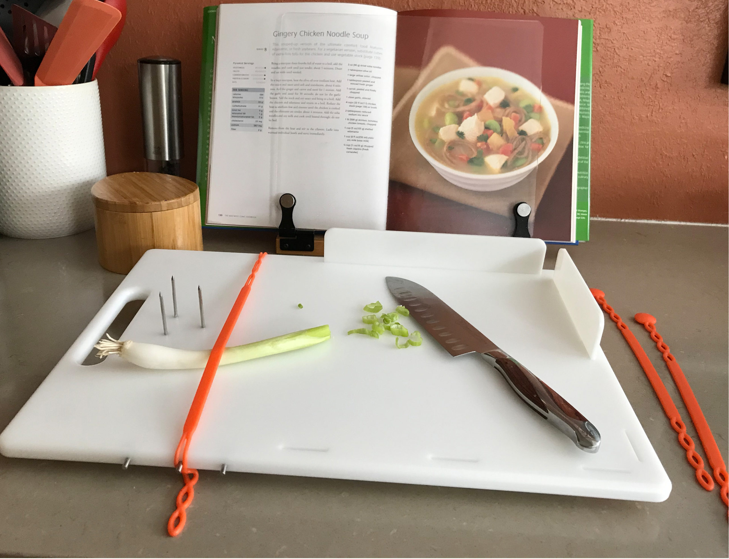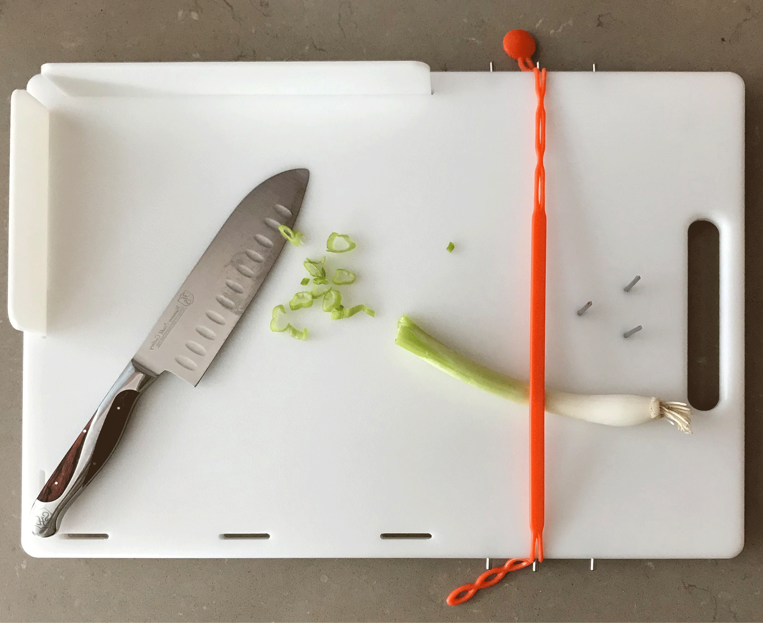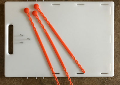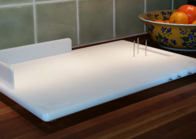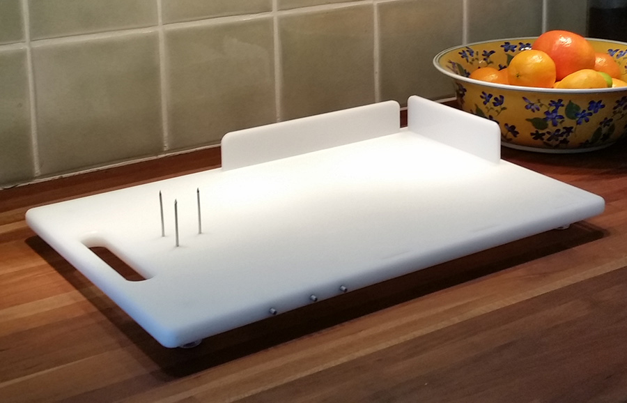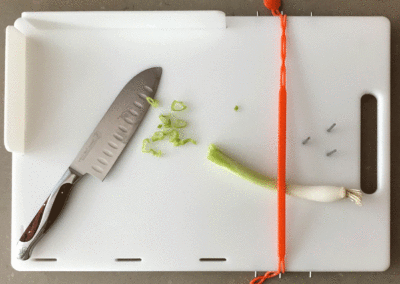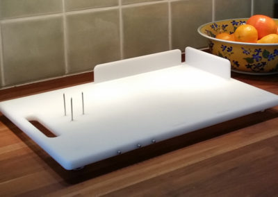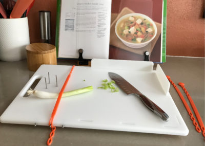 The One Hand CanDo Cutting Board, created by a stroke survivor who loves to cook, is specifically designed to facilitate a myriad of food preparation techniques using one hand. The inability to hold a food ingredient to prepare it, i.e. by slicing, chopping, shredding, mincing, etc, is no longer an issue when the one-handed cook has the patent pending CanDo Cutting Board in their kitchen tool arsenal. Special features include a strapping system to hold bunches of ingredients such as fresh herbs, 2 repositionable side walls that accommodate left or right handed use and three sharp, stainless steel prongs to impale food items on. Each board includes 2 heat resistant, dishwasher safe silicone straps. Great for kids, too, when used with the supervision of a responsible adult. Silicone strap colour and design may vary from those seen in videos. (Knife and other items shown in photos not included.). Measurements: Work surface 25.5cm x 36cm, Overall measurements 27.5cm x 40cm x 1.5″