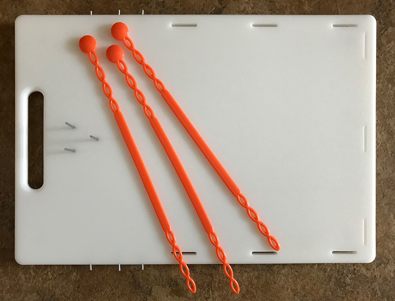Includes: 3 Stainless Steel spikes with safety cap, 2 Repositionable side panels for right or left handed user, 2 Silicone straps, Cut out handle, Slip resistant, non-marring silicone feet