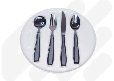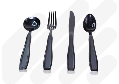Stainless steel, weighted cutlery that is designed for function while keeping an attractive appearance. Each piece is approximately 200g, helping to minimise the impact of shaking and tremors, and has a tapered handle to improve grip when eating.